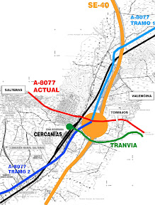 Se construirá una línea de tranvía entre la estación del Cercanías de Salteras-Valencina y la parada terminal del Metro en Mairena del Aljarafe, pasando por el Hospital de San Juan de Dios en Bormujos. Por ahora, se desconoce el trazado concreto por Gines y Valencina, salvo las referencias que aparecen en el Anteproyecto de la A-8077 [+] o en los planos del POTAUS [+]. La Delegada de Obras Públicas anunció [+] que el trazado se conocería el pasado diciembre y que las obras se pondrían en marcha por tramos.